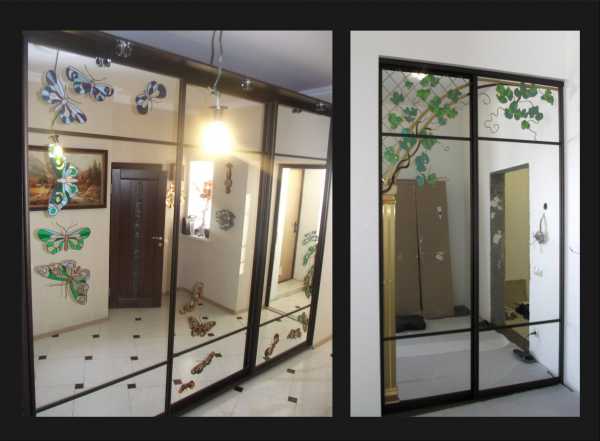 Большую популярность завоевали изделия, декорированные различными рисунками и узорами. Существует несколько способов украшения гардеробной раздвижной двери, перечислим их: