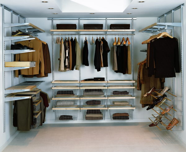 КорпуснаяЛучший материал для систем хранения – металл. Для изготовления используют нержавеющую и обработанную антикоррозийными составами сталь, алюминий. Материал устойчив к действию влаги, не накапливает пыль и грязь. Полки и ящики можно делать из дерева. В квартирах можно увидеть и встроенные гардеробные в 2 х 2 метра с металлическим наполнением.