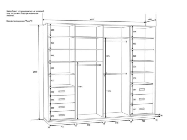 Создавая пространство, подобное гардеробной, своими руками, следует рассмотреть на примере чертежи и схемы готовых проектов.Один из вариантов представлен ниже. Некоторые идеи помогут создать наиболее удобный вариант планировки.