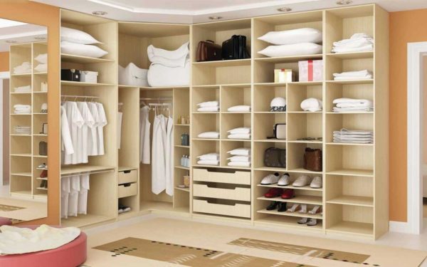 Угловая | Подходит отгороженный отсек комнаты, имеющий треугольную или трапециевидную форму. Стеллажи, полки размещают на стенах, а в центре остается свободное пространство, позволяющее переодеваться. Недостаток – «отсечение» угла визуально изменяет пропорции основного помещения.
