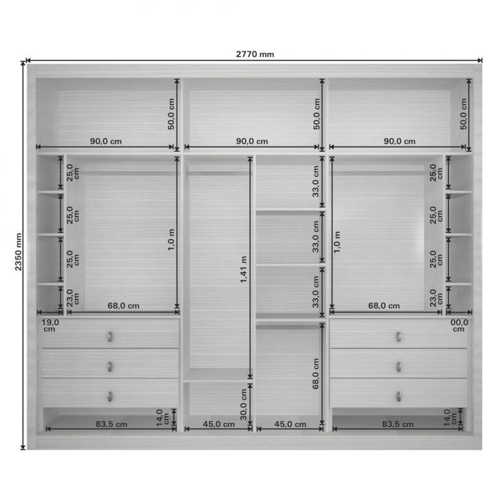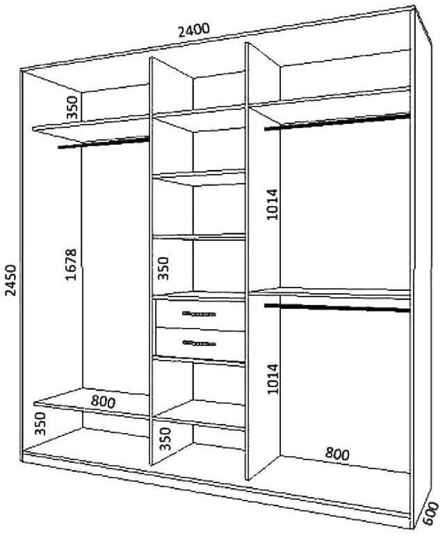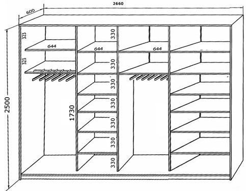 - При планировке конструкции на первом месте стоит сектор для вешалок с длинными вещами. Он один из самых крупногабаритных. Остальные отсеки меньших размеров распределяют традиционно: головные уборы вверху, обувь внизу, центральная часть отводится под текстиль.