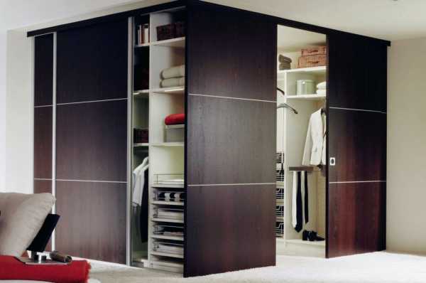 Это конструкция подойдет для маленьких комнат. Для них не нужно предусматривать дополнительное пространство. Дверные полотна свободно перемещаются по горизонтальным направляющим. Конструкции устанавливаются достаточно просто своими руками. Фото гардеробных систем с раздвижными полотнами размещены в каталоге в конце нашего обзора.