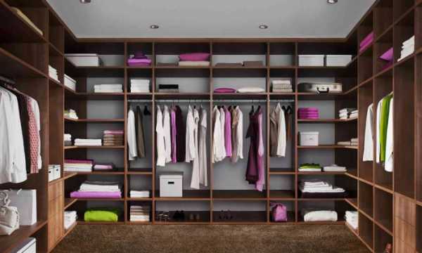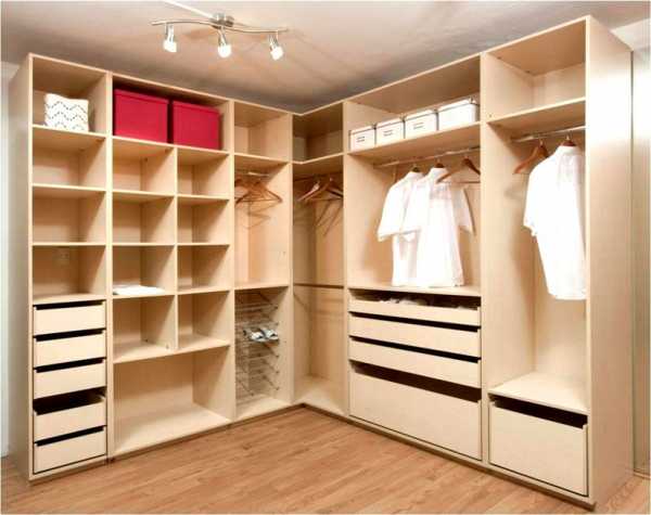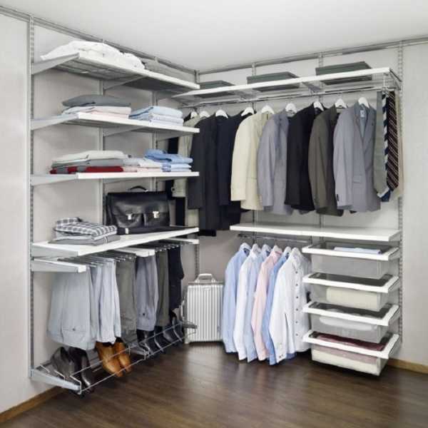 Для угловых систем применяют открытые стеллажи и стойки.Готовые идеи в проектах гардеробных комнат можно посмотреть в галереях в интернете.