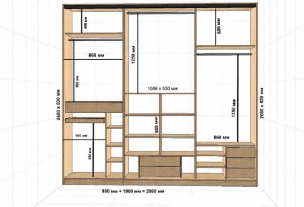 - Сложите глубину полок или шкафа типа купе, ширину прохода и ширину двери.
