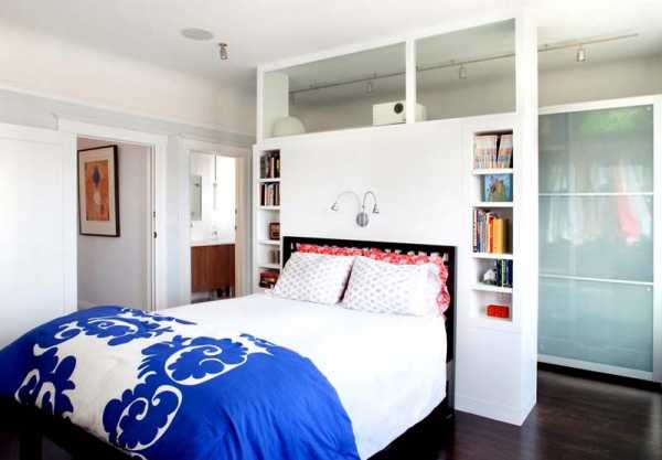 Интересным решением станет устройство гардеробной у изголовья. Перегородки можно выполнить в виде раздвижных конструкций или стационарно.