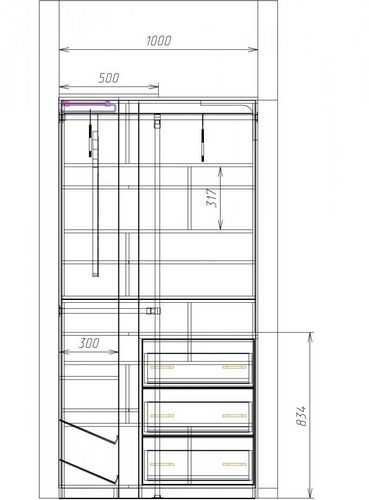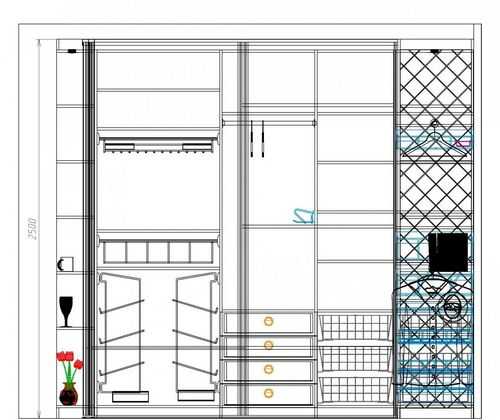 - При планировке конструкции на первом месте стоит сектор для вешалок с длинными вещами. Он один из самых крупногабаритных. Остальные отсеки меньших размеров распределяют традиционно: головные уборы вверху, обувь внизу, центральная часть отводится под текстиль.