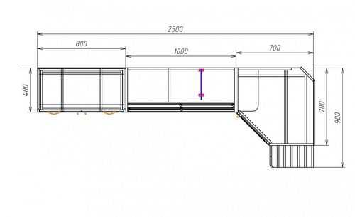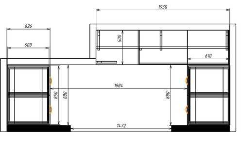 - Если будете покупать выдвижные ящики, то глубину этих выдвижных ящиков умножаете на 2 и складываете с шириной прохода. Оптимально – 1 м.
