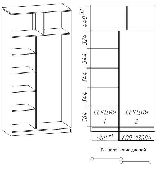 - ширина шкафа купе тоже ограничена размерами листа ДСП. Для ее увеличения в чертеж добавляют перегородки. При этом готовая конструкция будет состоять из двух или более модулей;