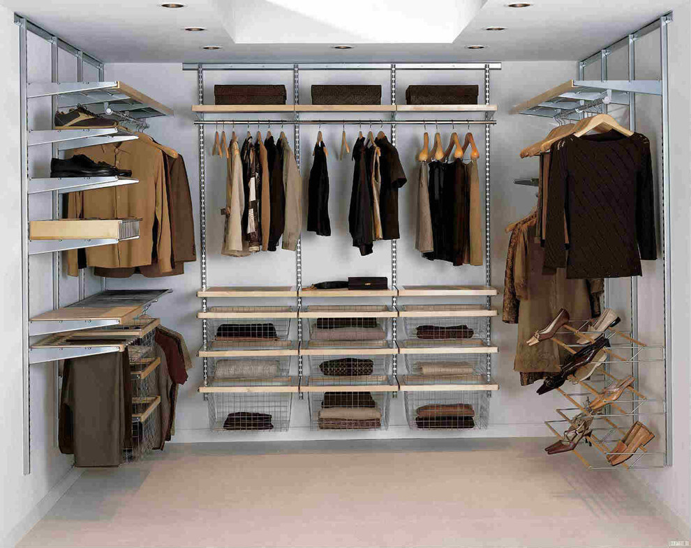 Важно пересортировать вещи для определения нужного количества вешалок, полок, коробок или ящиков. Составьте пару эскизов, проведите семейный совет. Добавьте несколько лишних полок на всякий случай. Учтите, конструкция сетки способна выдержать не больше 70 кг. - Процесс монтажа. Оптимальное расстояние между полками должно быть не меньше 40 см друг от друга. Параметры глубины полочек – не менее 40 см, по стандарту. Чтобы длинные не прогибались, добавьте опору. Для вместительности на штангах, расстояние между ними должно быть не меньше 100 см, возможно добавление однорядной штанги. Чтобы предметы не высыпались из выдвижных конструкций, фиксируйте их на прочную фурнитуру, ниже линии груди. Если предполагаются корзины для расположения тяжелых (зимних) вещей, располагать их нужно ниже своего роста.