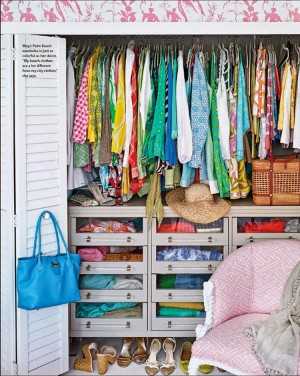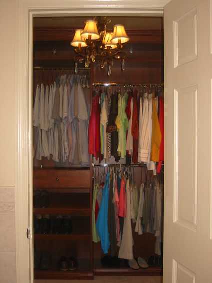 Как и чем заполнить гардероб, чтобы рационально использовать площадь комнаты? Одним из постоянных атрибутов каждой гардеробной комнаты являются штанги с плечиками, которые располагаются по комнате в зависимости от размера площади параллельно или перпендикулярно. Кроме того, такая штанга может быть оснащена так называемым лифтом, который позволяет, выбирая одежду, опускать или поднимать ее. Конечно, это достаточно дорогое удовольствие, и зачастую применяется только в дорогих модных магазинах. И по размеру такая штанга может не подойти в помещение бывшей кладовой. Однако это не беда, ведь существует еще много других специальных приспособлений, таких как полочки, ящики и крючки. К слову, оборудовать открытые полочки лучше всего на уровне с глазами, так как это позволит сразу видеть, что на них находиться. Хорошей идеей для гардеробной является также использование плетеных корзин. Такие корзины, как правило, вместительны и хорошо пропускают воздух, защищая при этом одежду от пыли.