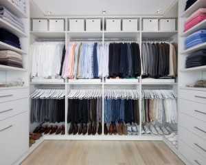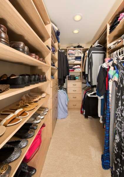 Соотношение открытых и закрытых секций в гардеробной должно составлять 1:1 – именно такие пропорции позволят внутренней части помещения выглядеть органично. Полки для обуви нужно располагать в нижней части, а секции для постоянно используемых вещей – на уровне груди. Отдельные полки нужно сделать для рубашек, джинсов и свитеров. Если семья большая, удобно отвести каждому члену семьи по несколько индивидуальных секций.