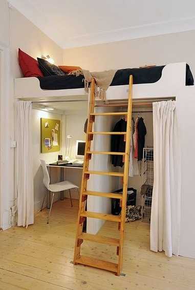 Этот вариант не занимает много места, но комфортный в использовании, даже отделяясь от общей комнаты красивым занавесом.