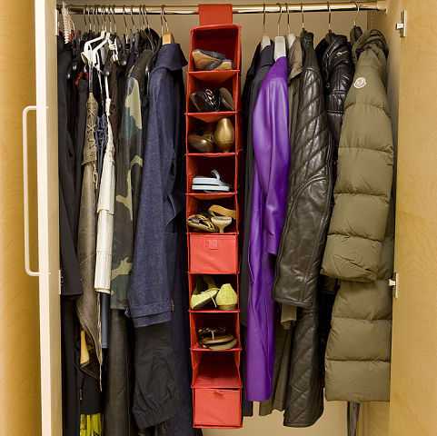 Верхние полки необходимо заполнять сезонными вещами, которые вы будете использовать только в определенное время года при определенной погоде. К примеру, это могут быть пальто, куртки и всевозможная зимняя одежда. Не следует такие полки делать большими, так как потом будет проблематично найти и достать необходимую вещь. Так как некоторые полки могут находиться практически у потолка, можно обзавестись не большой, но прочной лестницей, чтобы меть возможность удобно доставать одежду.