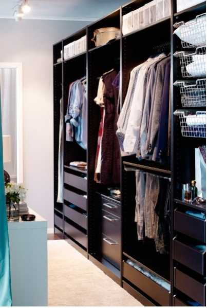 «При обустройстве гардеробной комнаты из кладовки первостепенным вопросом становиться выбор между стеллажами или ящиками»
