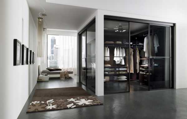 Неплохо смотрится вход в гардеробную, выполненный в прозрачном исполнении. Такое дизайнерское решение помогает соблюдать идеальный порядок, предотвращает создание неопрятного пространства.