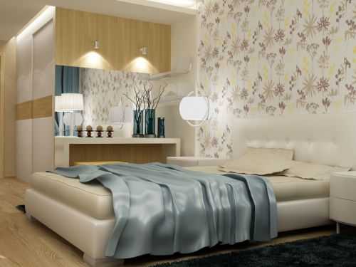 При выборе спальни со встроенной гардеробной следует обращать особое внимание на цветовое исполнение. В данной ситуации лучшие результаты показало применение светлых оттенков (белые, бежевые, нежно-пастельные). Указанный случай не предусматривает использование обоев, имеющих орнамент. Используя такой проект, лучше всего применять декоративную штукатурку или клеить жидкие обои.