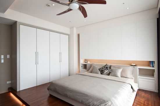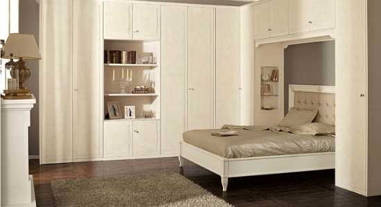 В квадратных спальнях встроенный шкаф обычно устраивают вокруг изголовья кровати, иногда с переходом на смежную стену. Угловая конструкция позволяет максимально задействовать площади.