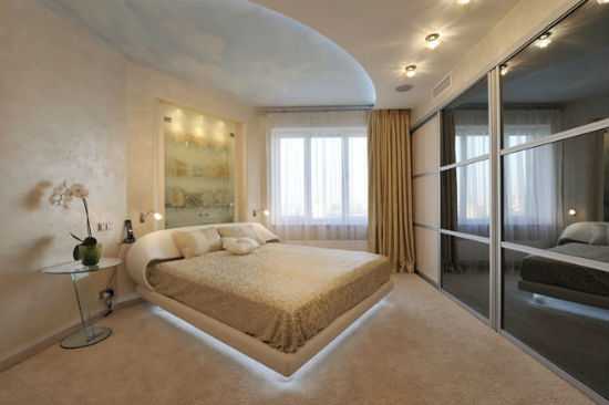 При выборе освещения спальни необходимо исходить из потребностей людей, проживающей в ней. Чтобы не ошибиться, необходимо использовать трехуровневое освещение. Также можно для сбережения электроэнергии применить светодиодную ленту.