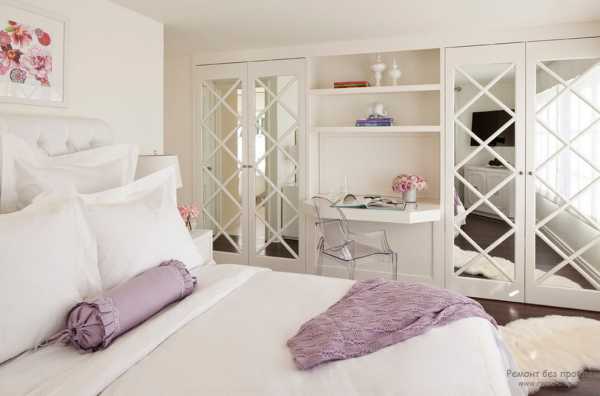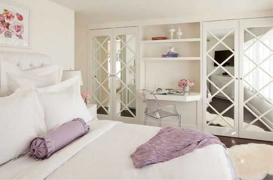 Дизайн спальни с гардеробной, на фото встроенный шкаф, светлый цвет и отражающая поверхность облегчают громоздкую конструкцию