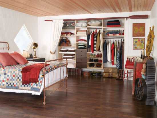 Если использовать угловую гардеробную, то совсем не обязательно делать ее отдельной комнатой. Обычно она имеет вид самого простого шкафа и размещается в том месте, где больше ничего из мебели не поместится. При этом, она получается весьма вместительной и функциональной, несмотря на то, что занимает совсем мало места. В связи с этим, такой вариант просто идеален для малогабаритной спальни.
