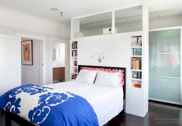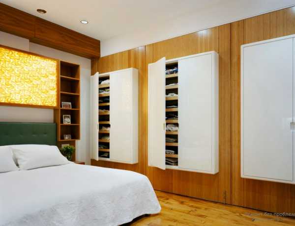 В типовых квартирах под места хранения выделяют место сбоку от входа в спальню. Перпендикулярно двери устанавливают гипсокартонную перегородку 400-900 мм, получается ниша. Внутри монтируют мобильные системы, что достаточно просто сделать своими руками, либо заказывают встроенные стеллажи, тумбы. Вид створок зависит от свободного места перед шкафом: если осталось 600 и более мм, можно смело делать распашные дверцы, меньше – помогут раздвижные системы по принципу купе.