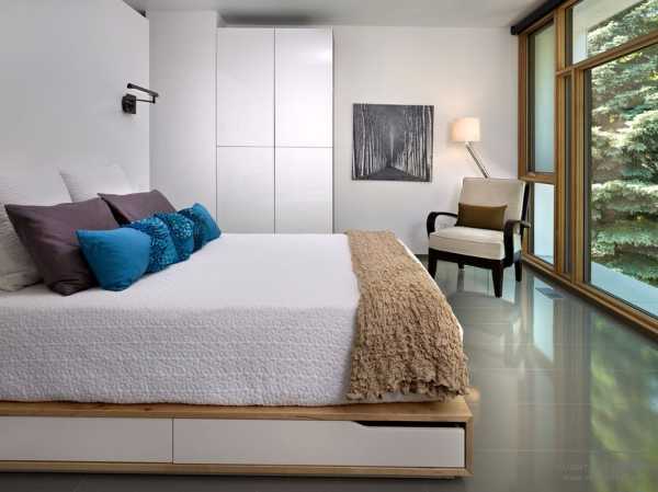 При желании, вы можете скрыть место для хранения, установив над потолком гардину, с которой будут красиво ниспадать драпированные шторы. Особенно эффектно будет смотреться в спальне комбинация текстильных изделий, выполненных из разных по фактуре материалов, например, из бархата и шифона. Если комната для отдыха оформлена в минималистичном стиле, драпировки из тканей можно заменить циновками из бамбука.