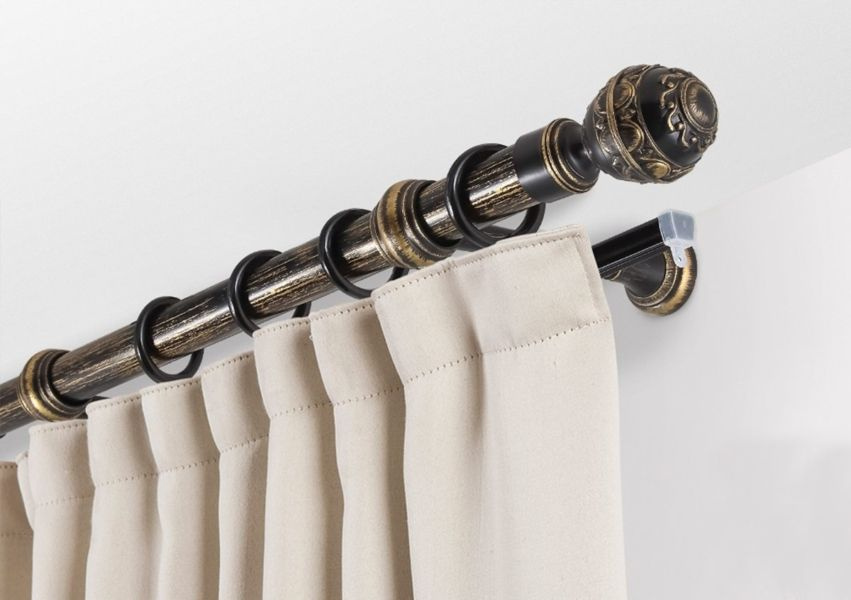 - Шаг 3. Одеваются шторы и закрепляются декоративные торцевые элементы. Обычно они просто одеваются на трубу, как в нашем случае.