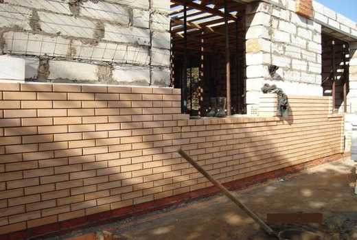 Ограждения, сложенные из газосиликатных изделий, нередко облицовывают декоративным кирпичом. Делается это с целью формирования эстетичного вида фасада здания. В то же время облицовка выполняется на расстоянии от основания газобетонных стен. Зазор между стенами заполняют арматурным каркасом с укладкой утеплителя.