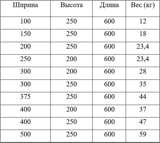 Размер: 600х250х500 мм. Его объем будет составлять: 0,6х0,25х0,5=0,075 м³. При плотности D600, такой камень будет весить: 0,075х600=45 кг.