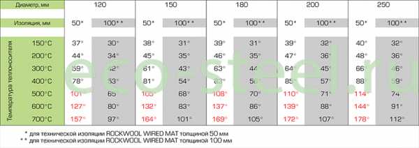 Таблица зависимости температуры на наружном контуре сэндвич дымохода от диаметра дымохода и температуры теплоносителя