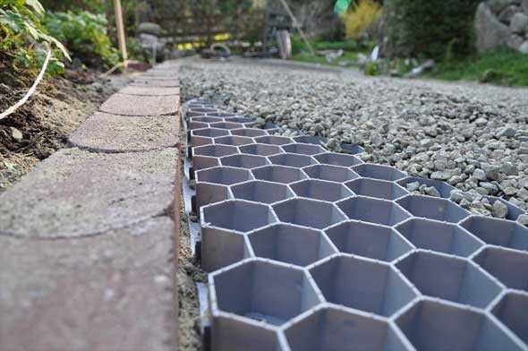 Плоская георешетка разделяет инертные слои, прочно укрепляет наполнитель на поверхности почвы. Им может выступать любой синтетический материал или же мелки, крупный щебень.