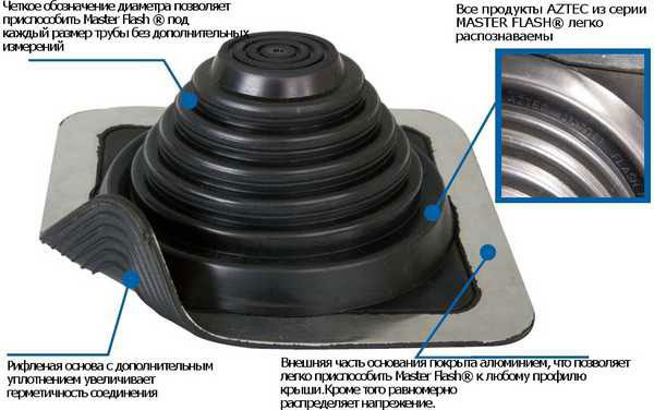 - Мастер Флэш – эластичная проходка на каучуковой основе в виде ступенчатой воронки, армированной алюминиевой сеткой внутри. Она подходит для крыш с любым уклоном скатов, любым кровельным материалом. Каучуковый фартук надежно защищает зазор от проникновения жидкости. Чтобы подогнать фартук под размер трубы, его обрезают до нужного диаметра. На скат фартук фиксируют саморезами, а к трубе – с помощью стального хомута.
