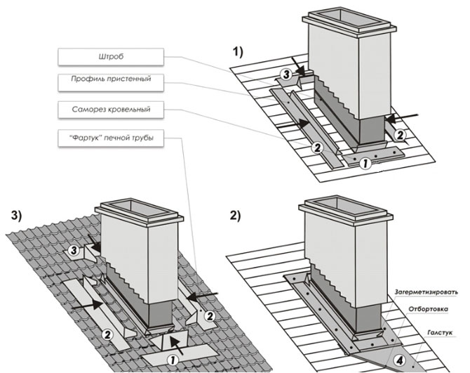 При использовании традиционного метода следует в нижней части трубы выполнить фартук из оцинкованного листа, его цвет должен совпадать с цветом кровельного материала. Выполнять работы требуется в следующем порядке: