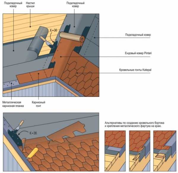 Подкладочный ковер укладывают на битумную мастику, которая предварительно наносится на прилегающую поверхность, саму рейку, а также зону нахлеста. - Поверх него с учетом нахлеста На поверхность препятствия с учетом нахлеста поверх ковра приклеивают гонты.