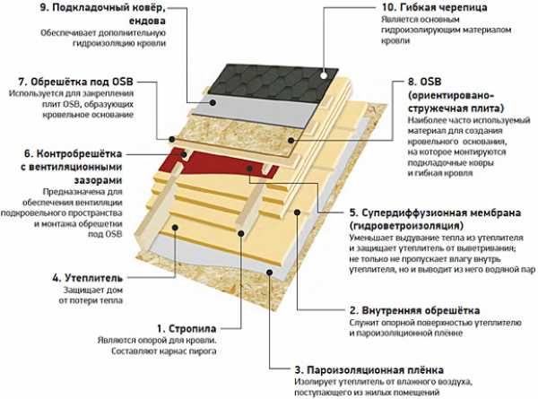 Как говорилось ранее, основанием для гибкой черепицы будет служить стропильная система, покрытая сплошной обрешеткой. Для обеспечения правильного кровельного пирога, внутри чердака на стропила фиксируется пароизоляция. Снаружи нужно уложить утеплитель и покрыть все это слоем гидроизоляции. Параллельно на сами стропила набиваются рейки, которые будут играть роль контробрешетки.
