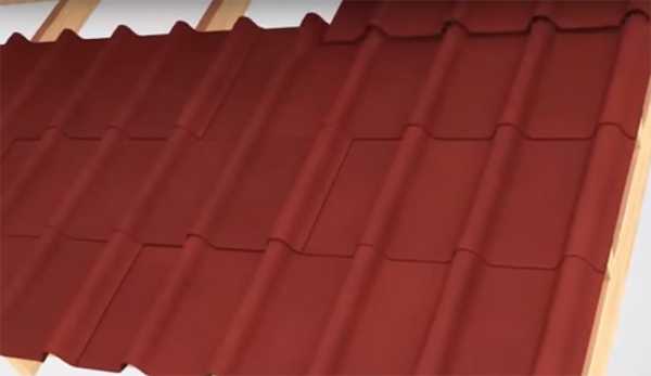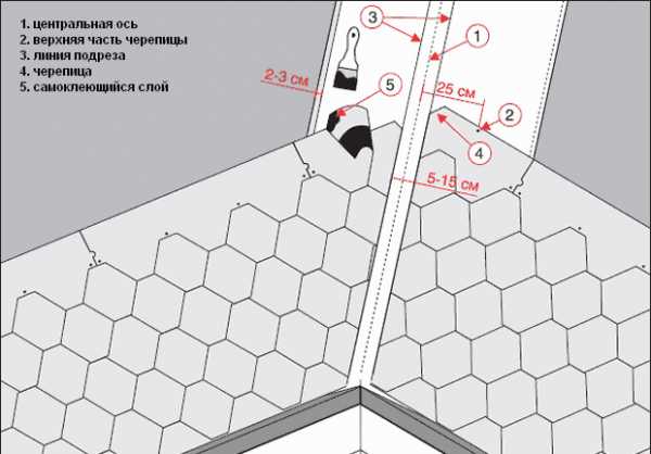 Для повышения надежности этого стыка, ендову необходимо проклеить дополнительным слоем из отдельных фрагментов черепицы. Их укладывают внахлест на соседние скаты, образующие ендовы, и проклеивают, используя битумную мастику.