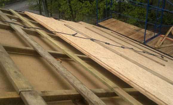 Но, подготовительные работы на этом не заканчиваются. Монтаж гибкой черепицы должен быть сделан на сплошную поверхность. Его можно сделать из шпунтованной доски, из теса, листов фанеры или плит ОСП. Важно, чтобы влажность дерева не была больше 20%. Будет лучше, если сделать обрешетку под гибкую черепицу два слоя. На контробрешетку с определенным шагом набивается обрешетка. И вот уже на нее будет выполнена установка сплошных плит.