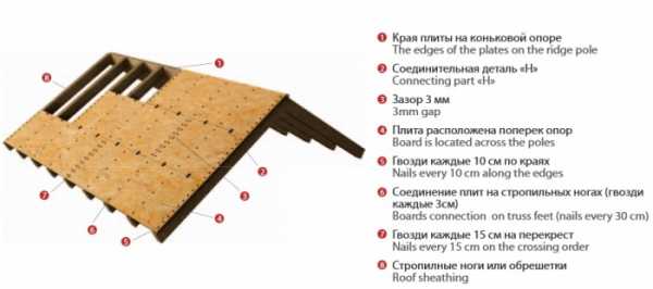 Начинать работу нужно снизу, продвигаясь вверх. Листы набиваются в шахматном порядке. Стыковать листы или доски нужно на опоре. Для обеспечения вентиляционного канала, важно делать деформационный шов между плитами. Его ширина не больше 1 см (обычно 3 мм достаточно). Ведь такой кровельный пирог, в котором доминирует гибкая черепица, важно хорошенько вентилировать. На схеме ниже видно, какова правильная технология монтажа.