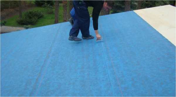 Настилают ковер снизу вверх, начиная от самого нижнего участка ската, с нахлестом. Перекрыв нижнюю полосу, верхняя не позволяет воде затечь под нее. Для фиксации подкладочного материала используют особый клей и гвозди.