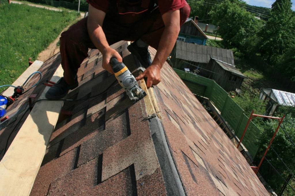 Гвоздь надо забить ровно. Если он войдет под углом, крепление не будет надежным. Шляпка должна только накрывать и удерживать битумную пластину. Если ее утопить, покрытие быстро «разболтается» и оторвется. Норма расхода метизов: 4 штуки на квадратный метр для ската с уклоном меньше 45˚ и 6 штук — для более крутых крыш. Проще всего работать с автоматическим инструментом. Это значительно увеличивает скорость монтажа.
