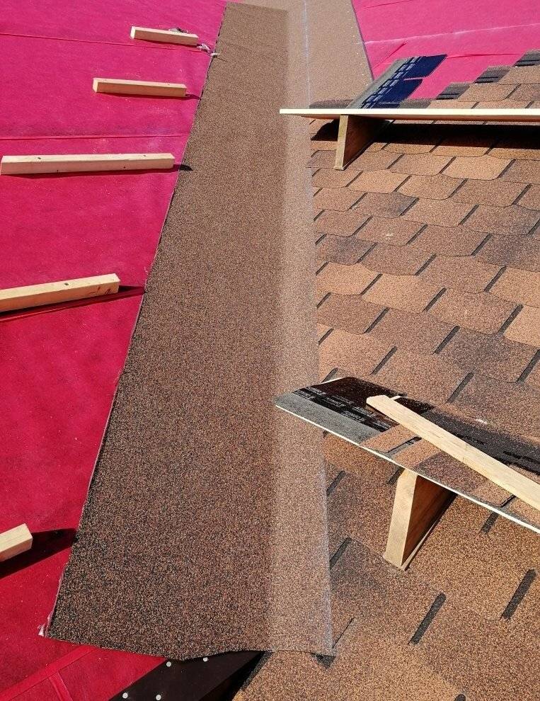 Перед тем как укладывать мягкую кровлю, проводится дополнительная гидроизоляция ендовы. Это одно из самых проблемных мест на крыше, поскольку именно здесь в теплое время года собирается вода, а зимой — снег и лед. В ендове укладывается специальное битумно-полимерное полотно, которое так и называется — ендовый ковер: