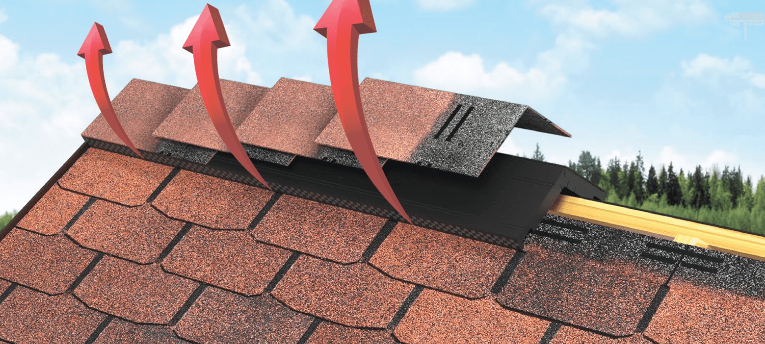 вентилируемый конек. Является частью системы вентиляции кровли, через него выходит воздух, циркулирующий в подкровельном пространстве и выводящий из него теплые влажные пары;