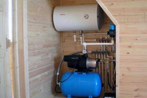 При выборе объема стоит помнить, что тот объем, который стоит в паспорте — это размер всей емкости. Воды в ней будет почти в половину меньше. Второе что надо иметь в виду — это габаритные размеры емкости. Бак на 100 литров это приличная такая бочка — около 850 мм высотой и 450 мм в диаметре. Для нее и обвязки надо будет где-то найти место. Где-то — это в помещении, куда приходит труба от насоса. Там обычно и устанавливают все оборудование.
