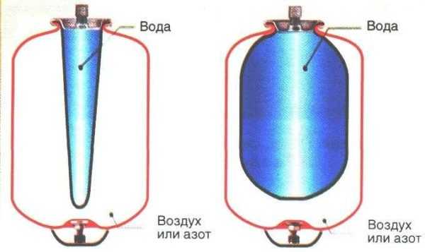 Гидроаккумулятор — это бак из листового металла поделенный на две части эластичной мембраной. Мембрана бывает двух видов — диафрагмы и баллона (груши). Диафрагма крепится поперек бака, баллон в виде груши закрепляют на входе вокруг входного патрубка.