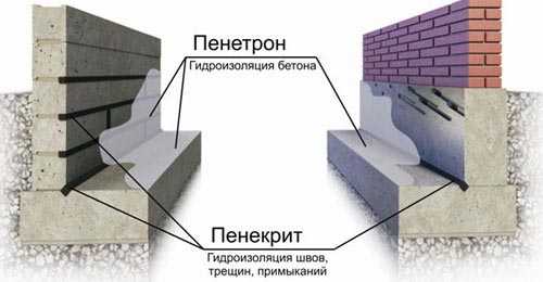 Если при защите бетона, а в частности фундаментов зданий от воды полимерно-битумными мастиками, рулонными или полимерными покрытиями необходима сухая поверхность, то для проникающей гидроизоляции напротив нужно чтобы материал был хорошо увлажнен т.к. за счет контакта с водой происходит активный рост кристаллов в порах бетона.