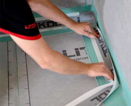 Нередко для гидроизоляции под плитку применяется рулонная изоляция. Понятное дело, что все работы выполняются непосредственно перед укладкой плитки. Для производства рулонной изоляции используется полиэстер и стекловолокно. Одна из сторон имеет клеящую поверхность. Этот клей обеспечивает качественное схватывание материала с полом/стеной.