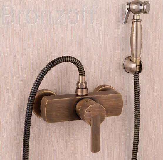 Второй вариант наружного монтажа — гигиенический душ на обычном настенном смесителе, который привычно видеть над ванной или в душевой. Подводка воды осуществляется в стене, снаружи устанавливается смеситель с рычагом, и отдельно — держатель для лейки гигиенического душа.
