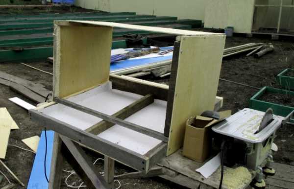 Следующий шаг — сборка днища ящика. Каркас так же из бруса, нижняя сторона зашивается, внутри утепляется алюминиевой фольгой и минватой или пенопластом. Здесь мы использовали остатки минваты, а сам курятник будем утеплять пенопластом. Чем плоха в данном случае минвата — в ней селятся насекомые, а для курятника это плохо.