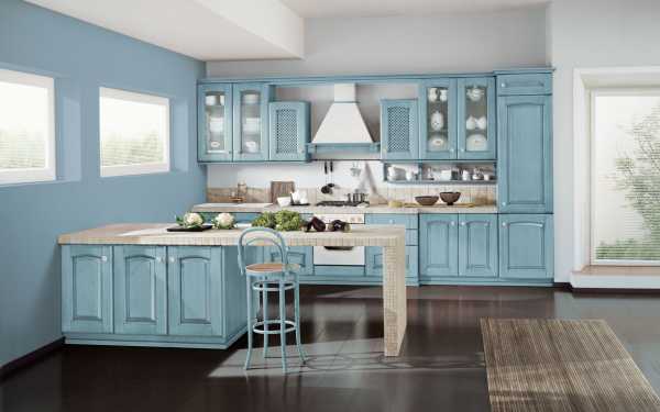 Голубой цвет в интерьере кухни можно комбинировать как со светлыми так и темными оттенками