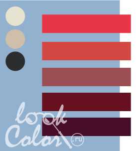 Серо-голубой сочетается с красным: светло-красным, ализариновым, марсала, рубиново-розовым, винным. Нейтральные: слоновая кость, латте, мокрый асфальт.